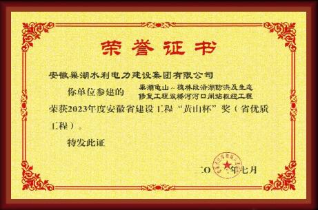 巢湖龜山~槐林段沿湖防洪及生態(tài)修復(fù)工程雙橋河河口閘站樞紐工程榮獲“黃山杯”獎( 省優(yōu)質(zhì)工程 )