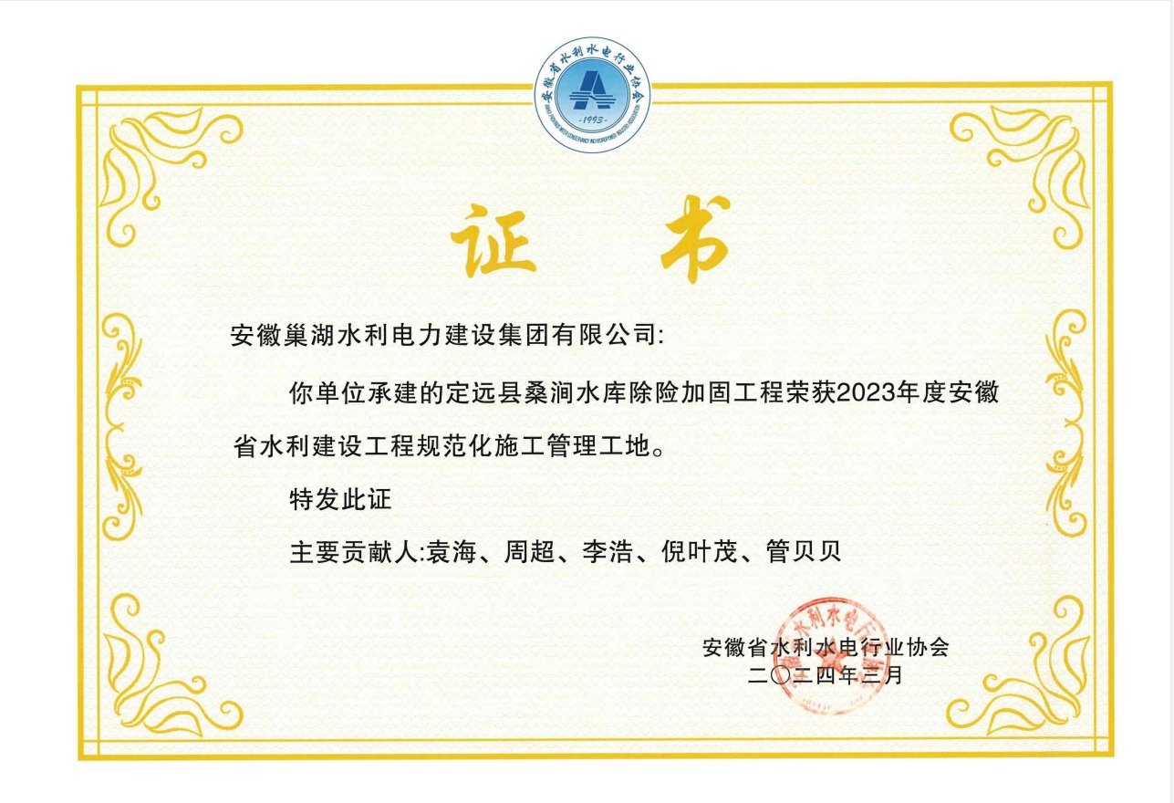定遠縣桑澗水庫除險加固工程榮獲2023年度安徽省水利建設工程規范化施工管理工地